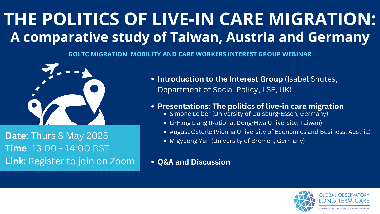 Date: 9 September 2025 Time: 1pm-2pm BST, you can check you local time here Join us for the second webinar of the Social Care Reform in England interest group, in this webinar we will cover: Introduction to the Global Observatory of Long-Term care and to the Social Care Reform in England Interest Group, Adelina […]