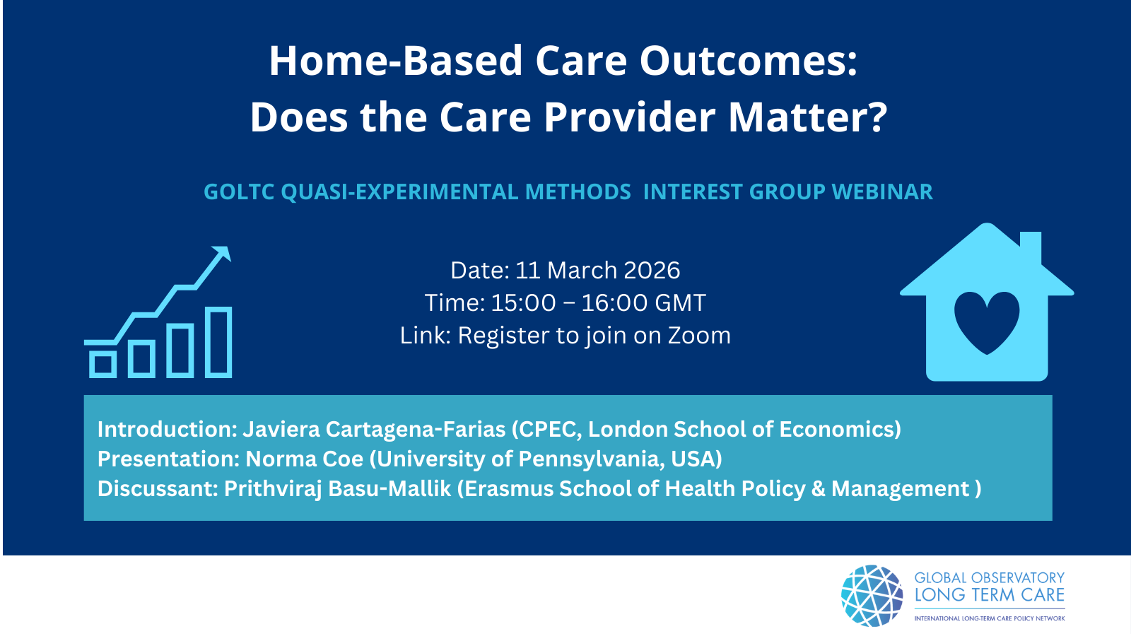 Home-Based Care Outcomes: Does the Care Provider Matter? GOLTC QUASI-EXPERIMENTAL METHODS Interest Group webinar Date: 11-March-2026 Time: 15.00-16.00 GMT (you can check your local time here.) Link: register to join on Zoom Long-term services in the home are predominately provided by family or friends, with a growing proportion of individuals receiving formal care, […]