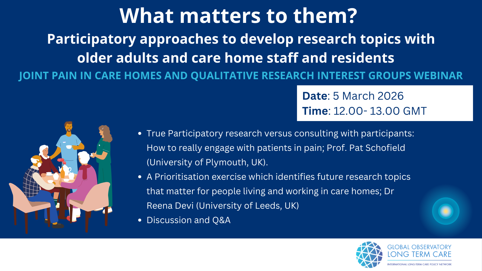 What matters to them? Participatory approaches to develop research topics with older adults and care home staff and residents GOLTC Pain in Care homes and Qualitative Research Interest Groups joint webinar Date: 5 March 2026 Time: 12:00-13.00 GMT, you can check your local time here Link: register to join on Zoom Pain management involves multiple components, including identification […]