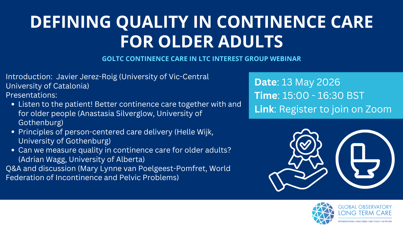 GOLTC Continence Care in long-term care Interest Group Date: 13 May 2026 Time: 15.00 to 16.30 BST (you can check your local time here) Link: register in zoom This webinar will explore how person‑centered principles can enhance the quality of continence care in long‑term care settings, emphasizing dignity, autonomy, and individualized support. Leading experts will […]