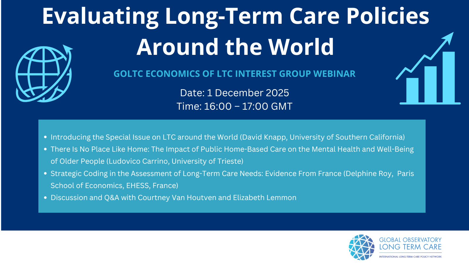 To promote the evaluation of existing LTC policies and the involvement of the scientific community in future LTC policymaking, the Gateway to Global Aging Data project organized a conference in November 2023 and eight paper were published in a special issue in Health Economics journal. The Global Observatory of Long-Term Care (GOLTC) will be hosting a webinar to bring together researchers, policymakers, and practitioners to discuss the LTC Policy Virtual Special Issue and present two of the papers by the authors.