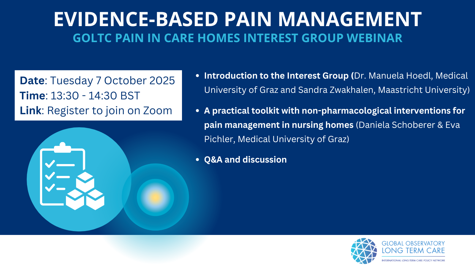 Pain is a common care problem among nursing homes residents. Even though pharmacological interventions often have limited therapeutic effect and compromises activities of daily living, and may even cause adverse, potentially fatal, side effects for residents, non-pharmacological interventions for pain management in nursing homes are seldom used. One explanation might be, that the non-pharmacological interventions may not be developed with the target groups and therefore not practical, feasible, or e.g., even not accepted by the residents. Therefore, in this webinar the joint development of a practical and feasible toolkit for implementing non-pharmacological pain management interventions in nursing homes is presented.